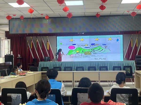 “原来学普通话这么好玩!”在乌尊镇中心小学的创意课堂上,孩子们兴奋地挥舞着手中的画作,将实践队员们团团围住,这堂正在进行的《我是小小推普员·汉字衍生画》课程,把汉字教学变成了一场妙趣横生的艺术探险。“大家知道吗?最早的‘日’字就像个圆圆的太阳。”宁波职业技术大学的董柳萱通过讲解甲骨文的演变过程,带领孩子们穿越三千年的文字长廊,引导学生发挥自己的想象力,让原本方正的汉字渐渐“活”了起来。课堂上,孩子们用水彩将“一帆风顺”“春夏秋冬”等词语绘成生动图画,在创作中理解汉字内涵,实践团队创新的“画中学”教学法,让普通话学习变成了最快乐的成长体验。