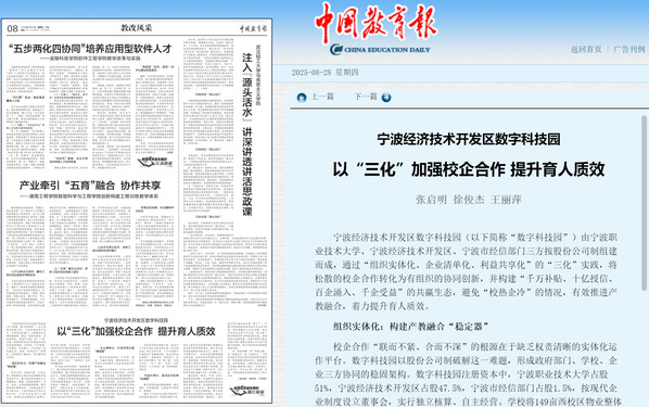 宁波经济技术开发区数字科技园(以下简称“数字科技园”)由宁波职业技术大学、宁波经济技术开发区、宁波市经信部门三方按股份公司制组建而成,通过“组织实体化、企业清单化、利益共享化”的“三化”实践,将松散的校企合作转化为有组织的协同创新,并构建“千万补贴、十亿授信、百企涌入、千企受益”的共赢生态,避免“校热企冷”的情况,有效推进产教融合,着力提升育人质效。