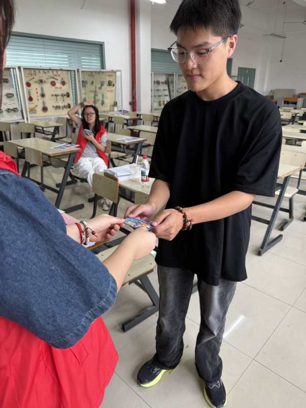 “网购理赔要谨慎,客服索要验证码都是诈骗!”“游戏交易走平台,私下转账要say no!”新生报到现场,一张张仅巴掌大小的反诈卡片采用高饱和警示色设计,正面印有“机电学子 智防诈骗”醒目标识,背面则集中列举了针对大学生群体的高发电信网络诈骗手法。卡片采用防水耐磨材质,可随身携带或粘贴在宿舍床头,成为随时可见的安全提醒。