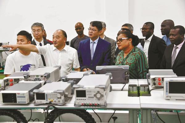 éé贝宁中等教育、技术教育与职业培训部部长V ronique Tognifod (前排右一)和中国驻贝宁大使张伟(前排右二)视察学习训练中心。