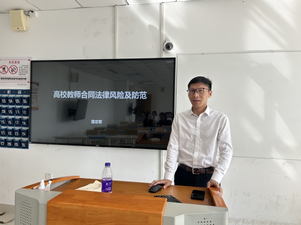 讲座现场,雷志军律师凭借跨学科的学术积淀与丰富的实务经验,为在场师生带来一场兼具专业性与实用性的知识盛宴。结合高校教师工作实际场景,雷志军律师将讲座内容分为“合同法律风险防范” 与 “用印规范” 两大核心板块。在合同风险防范环节,他精准梳理科研合作、物资采购、成果转化、横向课题合作等高频场景下的合同类型,以 “风险识别 — 案例拆解 — 策略应对” 为逻辑主线,逐一剖析合同签订前的主体资格审查要点、条款拟定中的权责边界界定方法、履行过程中的证据留存技巧,尤其针对 “格式条款无效情形”“违约责任约定模糊的法律后果”“知识产权归属争议解决路径” 等教师们普遍关注的问题,结合真实案例进行生动解读,让抽象的法律条文转化为可落地的操作指南。