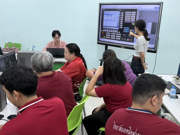 在为期10天的培训中,宁波职业技术大学赵益斌老师在实训教学中,针对现场设备配置情况,采取“分批分组轮训方式”,确保每位学员进行实操学习,同时也通过实践深入掌握了当地职业教育实际情况,拓宽了职业教育思路,为后续精准开展国际合作积累了宝贵经验。在数控机床教学环节,黄宽老师结合宁波数控技术领域的先进发展经验,向泰方教师分享了电脑编程在教学中的应用技巧,助力当地优化数控教学体系,充分发挥现有设备教学效能。