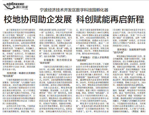 借助孵化器的平台优势,宁波职业技术大学牵头建设国家级别市域产教联合体和4个行业产教融合共同体,通过责任清单、任务清单等形式,将企业真实项目融入课程体系,开设 “数智思维”“创业项目运营”等特色课程,邀请孵化器内企业家担任兼职教师,2024年,共开设企业导师授课课程26门。同时,孵化器还支持高校科研团队带着科研成果创业,为团队提供知识产权服务、渠道(项目)对接服务以及场地、资金、政策的“绿色通道”,目前已有11个高校科研团队项目入驻,其中,2 个成长为国家科技型中小企业,3个成长为省级科技型中小企业。